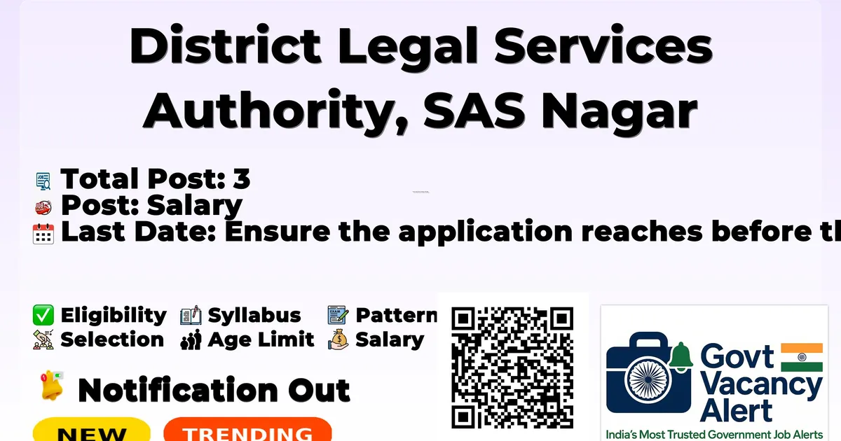 District Legal Services Authority, SAS Nagar (DLSA SAS Nagar) Recruitment 2026: District Legal Services Authority, SAS Nagar has released the official notification for 3 Legal Aid Defense Counsel posts, inviting applications from eligible candidates. This recruitment provides an excellent opportunity for candidates seeking stable and well-paid government jobs.