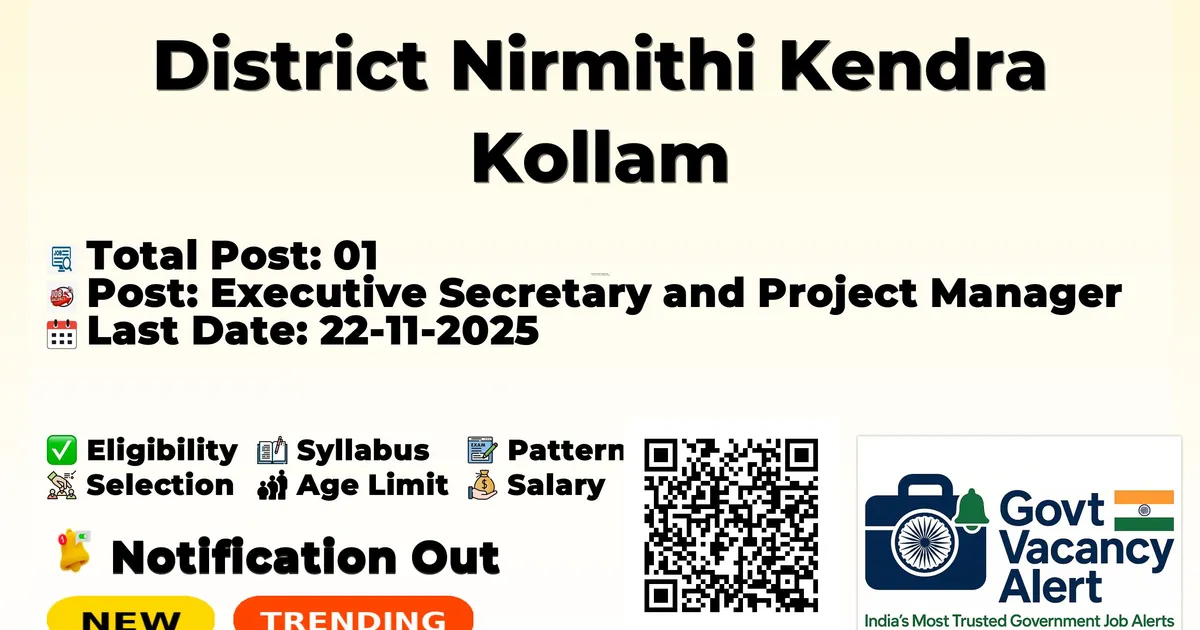 District Nirmithi Kendra Kollam has released an official notification for the recruitment of 01 Executive Secretary and Project Manager Posts. Interested and eligible candidates can apply Online through the official District Nirmithi Kendra Kollam website. The last date to submit the application form is 22-11-2025. In this article, you’ll find the District Nirmithi Kendra Kollam Executive Secretary and Project Manager Posts recruitment details, including eligibility criteria, age limit, salary structure, selection process, application steps, and direct links to the official notification and Online application form.
