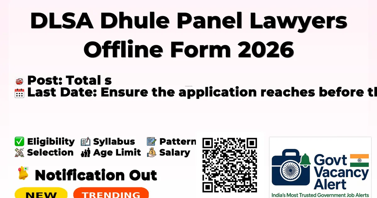 District Legal Services Authority Dhule (DLSA Dhule) has released an official notification for the recruitment of Panel Lawyers Posts. Interested and eligible candidates can apply Offline through the official DLSA Dhule website. The last date to submit the application form is 24-02-2026. In this article, you’ll find the DLSA Dhule Panel Lawyers Posts recruitment details, including eligibility criteria, age limit, salary structure, selection process, application steps, and direct links to the official notification and Offline application form.