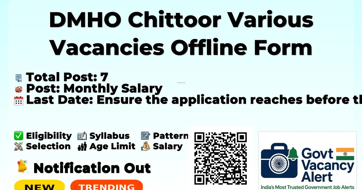 District Medical and Health Officer Chittoor (DMHO Chittoor) has released an official notification for the recruitment of 07 DEO, Lab Attendant and Other Posts. Interested and eligible candidates can apply Offline through the official DMHO Chittoor website. The last date to submit the application form is 20-02-2026. In this article, you’ll find the DMHO Chittoor DEO, Lab Attendant and Other Posts recruitment details, including eligibility criteria, age limit, salary structure, selection process, application steps, and direct links to the official notification and Offline application form.