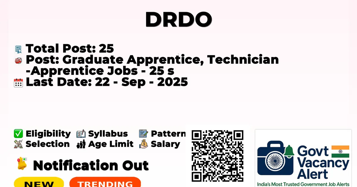The Defence Research and Development Organisation (DRDO) has officially released the notification to fill the vacancies of 25 Graduate Apprentice, Technician Apprentice Jobs. The interested and eligible candidates can use this opportunity to apply for these posts before the last date of application. Candidates who have completed their B.E./B. Tech, Diploma in Mechanical, Computer Science, Electrical, Electronics Engineering, can apply for the DRDO Recruitment 2025. The interested applicants can apply in offline mode. Here we have mentioned the education details, age limit, selection process, application fee, salary, and how to apply for these posts before the deadline. The application dates have already begun.