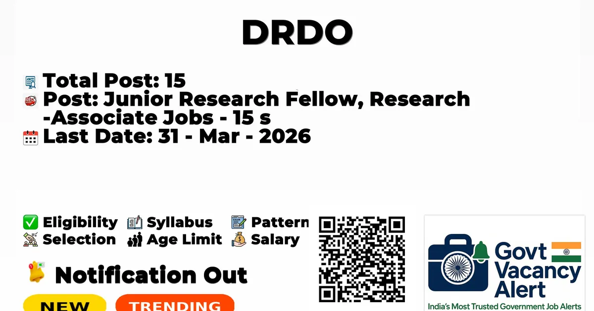 The DRDO Defence Research Laboratory (DRDO DRL) has officially released the notification to fill the vacancies of 15 Junior Research Fellow and Research Associate Jobs. Interested and eligibile candidates can use this opportunity to apply for these posts before the last date of application. Candidates who have completed their M. Pharm, M.Sc., M.E./M. Tech, Ph.D., can apply for the DRDO DRL Notification 2026. The interested applicants can attend the walk-in interview. Here we have mentioned the education details, age limit, selection process, application fee, salary, and how to apply for these posts before the deadline. The application dates have already begun.