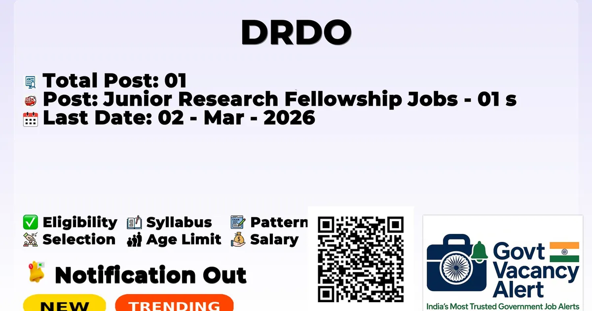 The DRDO Young Scientist Laboratory(CT) (DRDO DYSl-CT) has officially released the notification to fill the vacancies of 01 Junior Research Fellowship Posts. Interested and eligibile candidates can use this opportunity to apply for these posts before the last date of application. Candidates who have completed their B.E./B. Tech, M.E./M. Tech in Computer Science, Electrical, Electronics Engineering can apply for the DRDO DYSL-CT Jobs 2026. The interested applicants can apply in offline mode. Here we have mentioned the education details, age limit, selection process, application fee, salary, and how to apply for these posts before the deadline. The application dates have already begun.