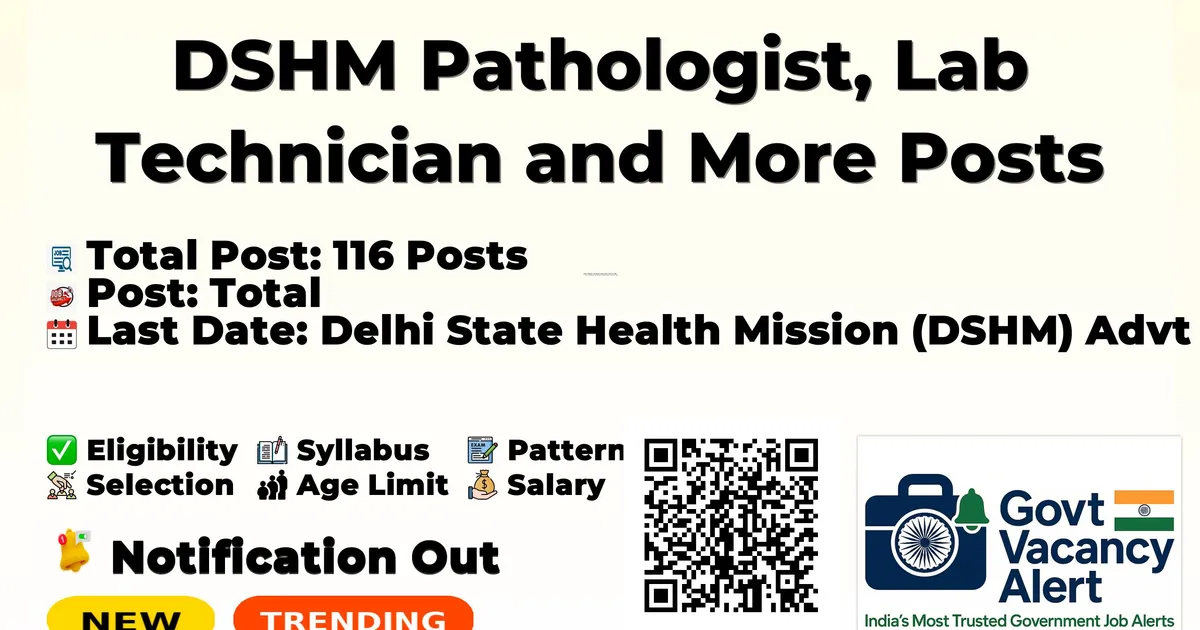 Advertisement The Delhi State Health Mission (DSHM) Recruitment 2026 notification released for 116 posts of Pathologist, Lab Technician and More Posts on 3 April 2026. Candidates with M.Sc, PG Diploma, M.Phil/Ph.D, MS/MD, DMLT, BMLT Can Apply Online. The Online application process for DSHM Recruitment 2026 has started on 03-04-2026 and will remain open until 17-04-2026. The candidate shall apply online through DSHM website, dshm.delhi.gov.in. FreeJobAlert - Your Personal Govt Job Finder 10M+Users 100+Jobs/day FreeAlways ⚡ Get Custom Govt Job Alerts - Alerts by Qualification, State and Interest. Set Free Alerts ● Free · No spam · Unsubscribe anytime · freejobalert.com The DSHM Pathologist, Lab Technician and More Recruitment 2026 Notification PDF has been released on 03-04-2026 at dshm.delhi.gov.in. Check the complete job details, vacancy, age limit, application fee, selection process and how to apply from the article. You can Check all Latest Sarkari Result Updates of All Central Government Jobs and State Government Jobs. DSHM Pathologist, Lab Technician and More Recruitment 2026 Notification PDF
