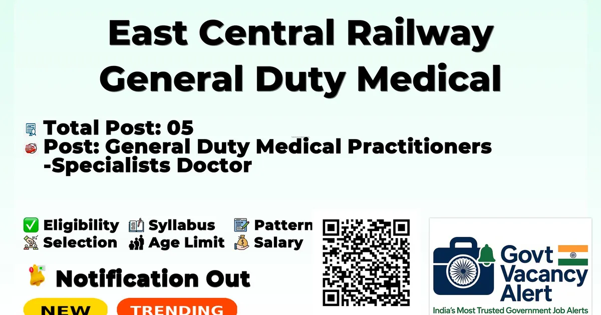 East Central Railway Recruitment 2025 for 05 posts of General Duty Medical Practitioners, Specialists Doctor. Candidates with MBBS, Degree/ Diploma Can attend the walkin. The Walk-in on 24-09-2025. For detailed information please visit East Central Railway official website, ecr.indianrailways.gov.in.