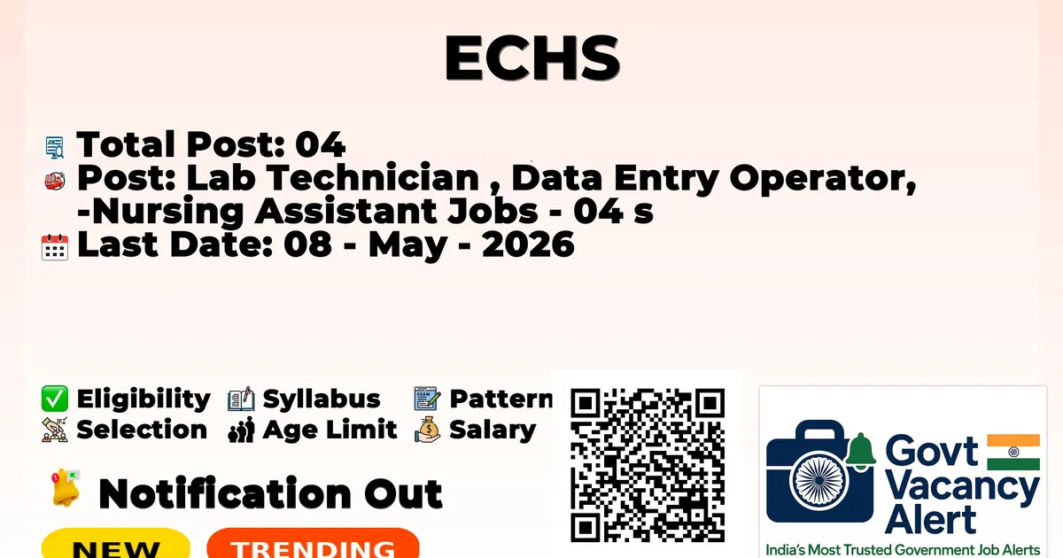Ex-Servicemen Contributory Health Scheme (ECHS Panaji) has declared the official notification for 2026. To fill up the vacancies for 04 Lab Technicians, Data Entry Operators, and Nursing Assistants. Those candidates who have qualified in the B.Sc, Any Degree, GNM can grab this chance and apply for the ECHS Recruitment 2026. Here, we included the age limit, selection process, salary structure, education details, application fee, and how to apply for these posts.