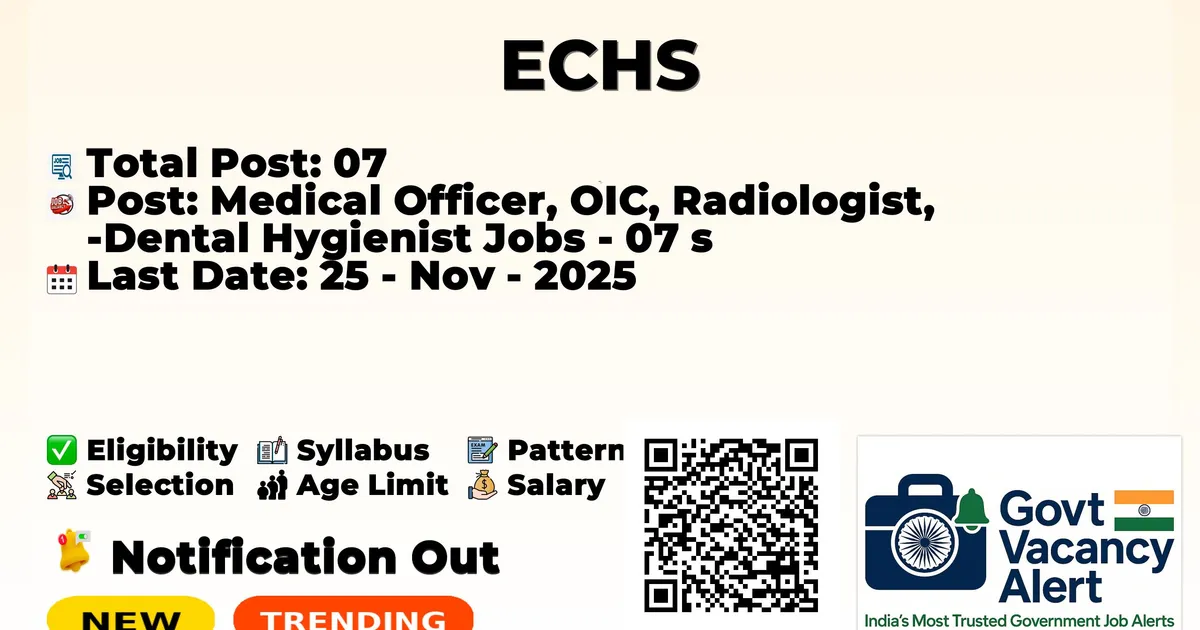 The Ex-Servicemen Contributory Health Scheme (ECHS) has officially released the notification to fill the vacancies of Medical Officer, OIC, Radiologist, and Dental Hygienist Jobs. Interested and eligibile candidates can use this opportunity to apply for these posts before the last date of application. Candidates who have completed their Any Degree, MBBS, MD/MS, and BDS can apply for the ECHS Recruitment 2025. The interested applicants can attend the walk-in interview. Here we have mentioned the education details, age limit, selection process, application fee, salary, and how to apply for these posts before the deadline. The application dates have already begun.