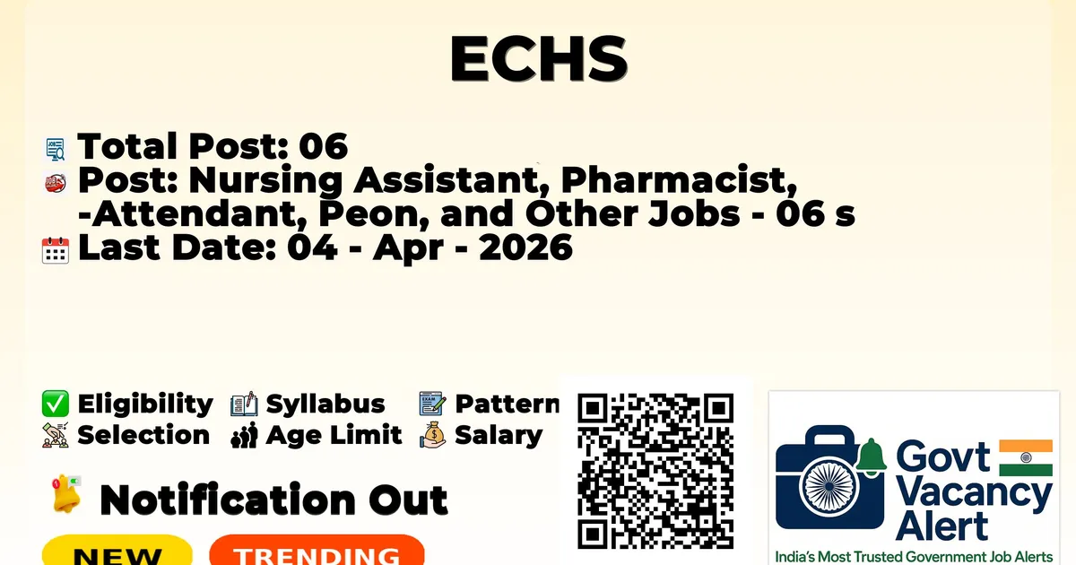 Ex-Servicemen Contributory Health Scheme (ECHS Hisar) has declared the official notification for 2026. To fill up the vacancies for 06 Nursing Assistants, Pharmacists, Attendants, Peons, and Other Jobs. Candidates who have qualified in the GNM, B.Pharm, 10th Pass, 08Th can use this chance and apply for the ECHS Recruitment 2026. Here, we included the age limit, selection process, salary structure, education details, application fee, and how to apply for these posts. Interested candidates can apply before the last date of application.