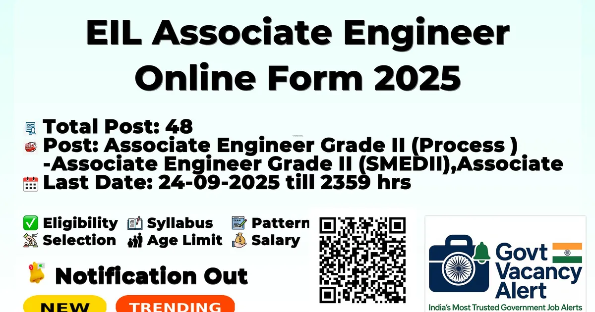 The Engineers India (EIL) Recruitment 2025 for 48 posts of Associate Engineer. Candidates with B.Sc, B.Tech/B.E Can Apply Online. The online application opens on 10-09-2025, and closes on 24-09-2025. The candidate shall apply online through EIL website, recruitment.eil.co.in.