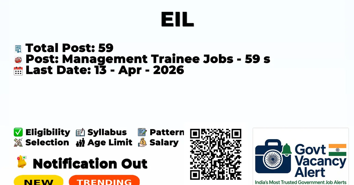 Engineers India Limited (EIL) has released an official notification for the recruitment of 59 Management Trainee Jobs. Those candidates who have qualified in the B.E/ B.Tech in Civil Engineering, Electrical Engineering, Chemical Engineering, and Mechanical Engineering can use this opportunity and apply for the EIL Notification 2026. Here, we included the age limit, selection process, salary structure, education details, application fee, and how to apply for these posts. Interested and eligible candidates can apply online before the deadline of the application.