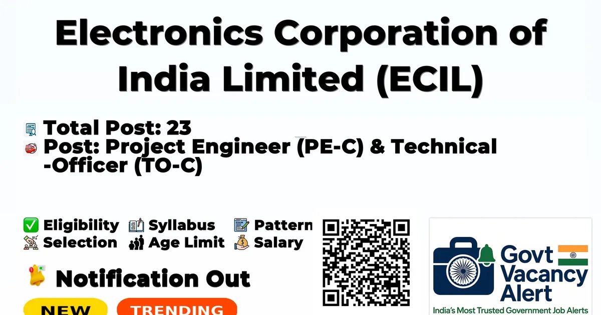 Company Name Electronics Corporation of India Limited (ECIL) Post Name Project Engineer (PE-C) & Technical Officer (TO-C) No of Posts 23 Salary Rs 25,506 to Rs. 55,000/- per month (Consolidated) Qualification B.E./B.Tech in CSE/IT/ECE/EEE/E&I/Instrumentation/Electronics, Diploma Age Limit Upto 33 Years Notification Release Date 05/12/2025 Walkin Date 16/12/2025 Official Website www.ecil.co.in