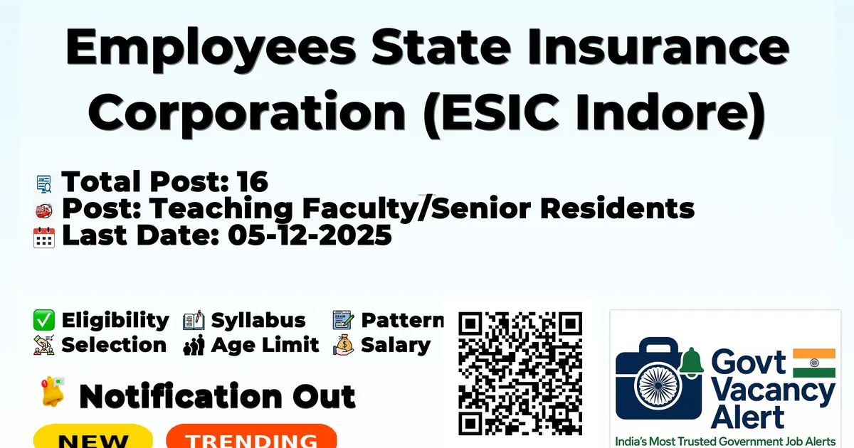 Details Information Organization Name Employees' State Insurance Corporation Medical College & Hospital, Indore (ESIC Medical College & Hospital, Indore) Post Name Teaching Faculty / Senior Residents Total Vacancies 16 Posts Salary/Pay Scale Rs 67,700 to 1,23,100 Educational Qualification As per NMC Norms for Teaching Faculty positions. For Senior Residents: MD / MS / DNB in the concerned subject. Age Limit Not Exceeding 45 Years (For Senior Resident) Not Exceeding 69 Years (except Senior Resident) Application Start Date 01/12/2025 Application End Date 05/12/2025 Application Mode Online Official Website www.esic.gov.in