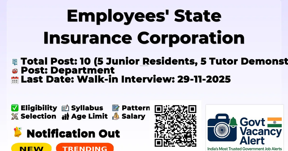 Company Name Employees' State Insurance Corporation (ESIC), Medical College Hospital, Varanasi Post Name Junior Resident, Tutor Demonstrator No of Posts 10 (5 Junior Residents, 5 Tutor Demonstrators) Salary Fixed Basic Pay Rs. 56,100/- plus admissible allowances Qualification As per NMC guidelines (see Gazette Notification No. CG-DL-E-05072025-264399 dated 30.06.2025) Age Limit Not exceeding 30 years as on 28-11-2025 (Relaxations as per rules) Start Date for Apply 18-11-2025 (Notification Date) Last Date for Apply Walk-in Interview: 29-11-2025 Official Website https://www.esic.gov.in