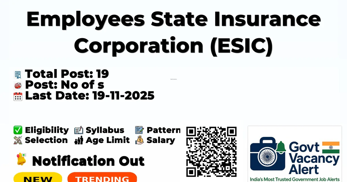 Company Name Employees State Insurance Corporation (ESIC) Post Name Teaching Faculty/ Senior Residents No of Posts 19 Pay Matrix Rs.67,700 - 1,23,100 Age Limit 45 years Start Date for Apply 03-11-2025 Last Date for Apply 19-11-2025 Official Website esic.gov.in