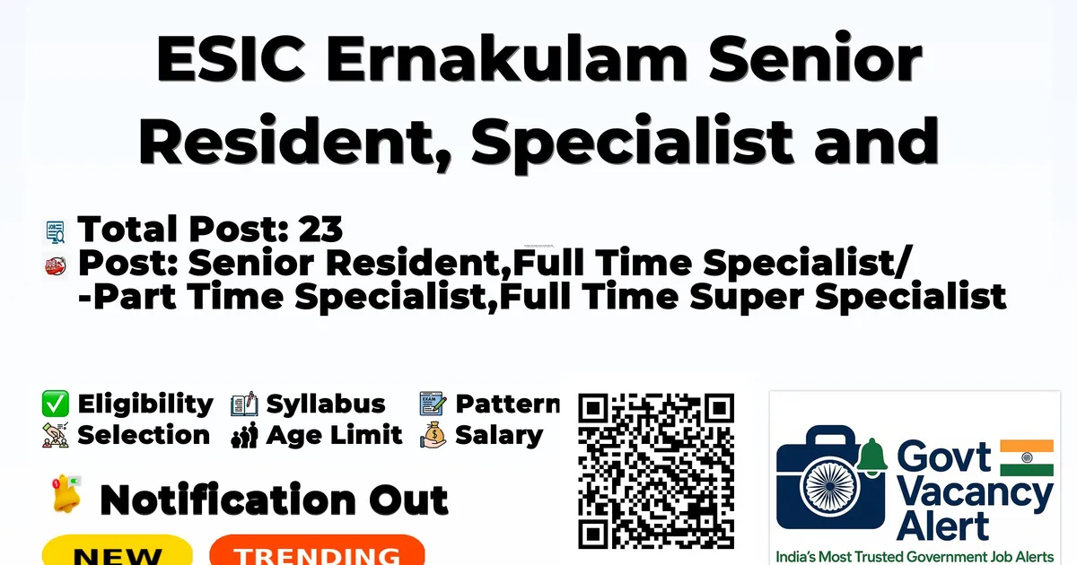 Employees State Insurance Corporation (ESIC Ernakulam) Recruitment 2025 for 23 posts of Senior Resident, Specialist and Other. Candidates with MBBS, DNB, MS/MD, M.Ch, DM Can attend the walkin. The Walk-in interview on 18-09-2025. For detailed information please visit ESIC Ernakulam official website, esic.gov.in.