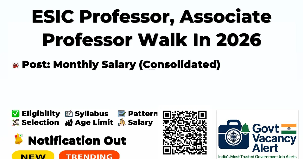 Organization Employees' State Insurance Corporation Medical College and Hospital Post Name Professor and Associate Professor Total Vacancies 18 Salary Rs. ₹ 1,47,986/- - ₹ 2,22,543/- Per Month Qualification MBBS + MD/MS/DNB in relevant subject with teaching experience Age Limit Max: 67 years Notification Date 18 February 2026 Walk-in Interview Date 25 February 2026 Website https://esic.gov.in