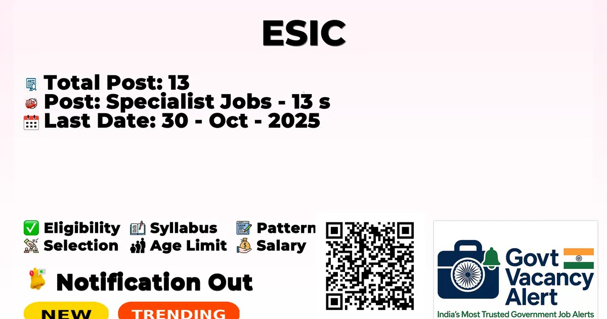 Employees' State Insurance Corporation (ESIC), Madhya Pradesh, has declared the official notification for 2025. To fill up the vacancies for 13 Specialist Jobs. Those candidates who have qualified in the MBBS, Post-Graduation, and Diploma can grab this chance and apply for the ESIC MP Recruitment 2025. Here we include the age limit, selection process, salary structure, educational details, application fee, and how to apply for these posts. Interested candidates can attend the walk-in at the address given below.