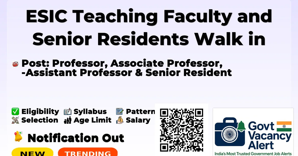 Details Information Organization Name Employees' State Insurance Corporation Medical College & Hospital, Naroda-Bapunagar, Ahmedabad, Gujarat (ESIC) Post Name Professor, Associate Professor, Assistant Professor & Senior Resident Total Vacancies 8 Posts (including Teaching Faculty & Senior Residents) Salary/Pay Scale Professor: Rs. 1,18,500/-; Associate Professor: Rs. 78,800/-; Assistant Professor: Rs. 67,700/-; Senior Resident: Rs. 67,700/- fixed basic pay per month plus applicable allowances as per ESIC HQ orders Educational Qualification As per latest National Medical Commission (NMC/MCI) guidelines for respective teaching faculty and Senior Resident posts Age Limit Teaching Faculty: Not exceeding 69 years as on 16/12/2025; Senior Resident: Not exceeding 45 years as on 16/12/2025; age relaxation as per Government of India norms Walk-in interview Date 16/12/2025 (cut-off for eligibility) Application Mode Offline (walk-in interview with completed application form and documents; Google Form submission as per notice instructions) Official Website www.esic.gov.in