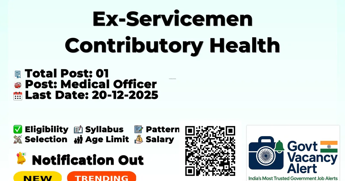 Company Name Ex-Servicemen Contributory Health Scheme (ECHS) Post Name Medical Officer No of Posts 01 Salary Rs. 95,000/- (Fixed Remuneration) Qualification MBBS with minimum 5 years post-internship experience Age Limit For employment: up to 66 years; For contractual service: up to 68 years Start Date for Apply Open now Last Date for Apply 20-12-2025 Official Website www.echs.gov.in