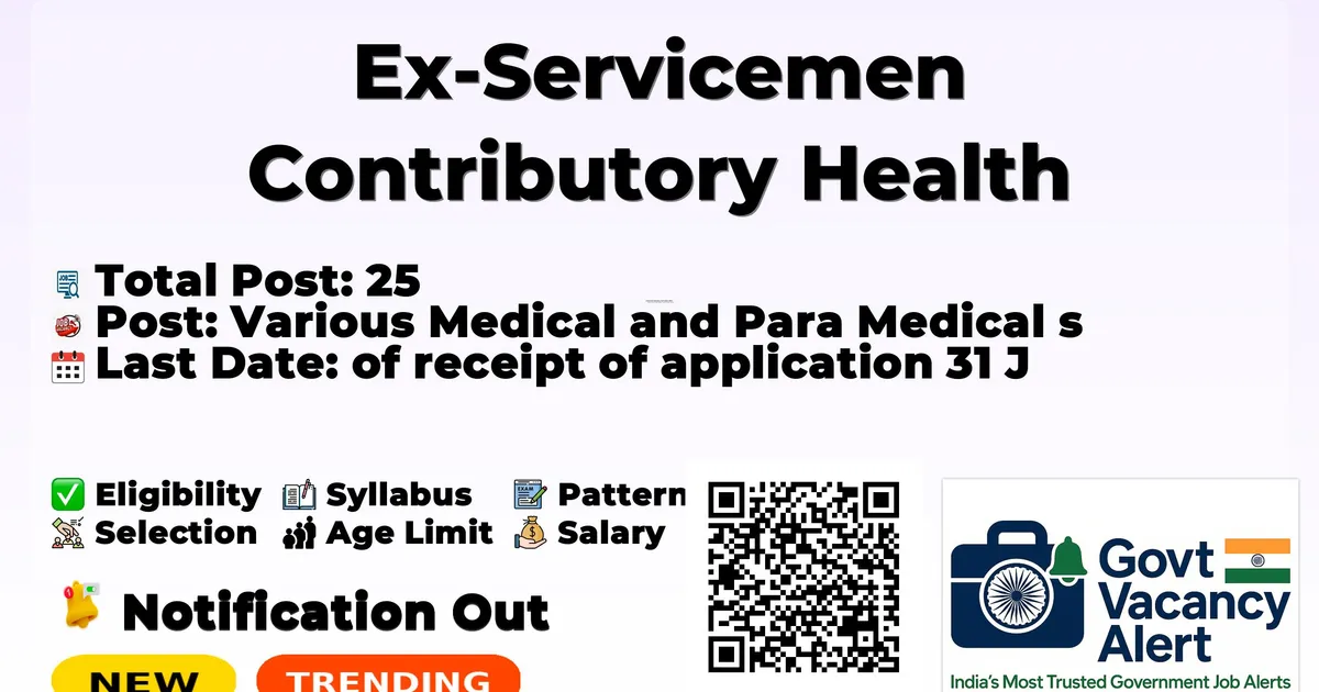 Company Name Ex-Servicemen Contributory Health Scheme (ECHS) Post Name Various Medical and Para Medical Posts No of Posts 25 Salary Rs. 21,800/- to Rs. 1,30,000/- Qualification As per post Last Date 31 January 2026 Official Website www.echs.gov.in