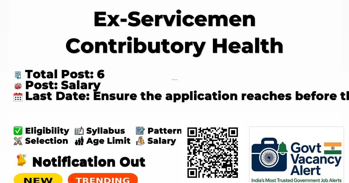Company Name Ex-Servicemen Contributory Health Scheme Post Name Medical, Para Medical & Non Medical Staff No of Posts 6 Salary Rs. 25,600/- to Rs. 1,30,000/- Qualification MBBS, MD/MS/DNB, Diploma in Dental Hygienist, GMN Diploma/Class-l Nursing Asst Course, 8th Class with driving license. Last Date 08 March 2026 Apply Mode Offline Job Type Contract