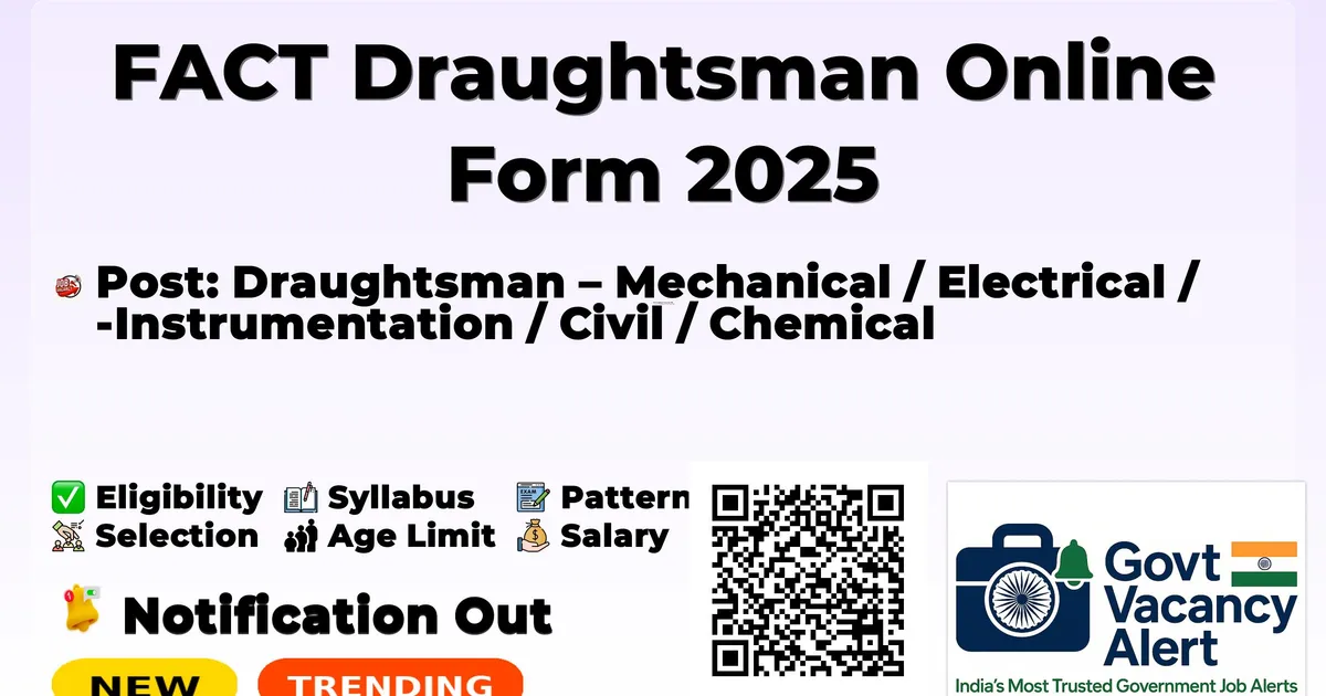 Fertilisers And Chemicals Travancore (FACT) has released an official notification for the recruitment of Not Mentioned Draughtsman Posts. Interested and eligible candidates can apply Online through the official FACT website. The last date to submit the application form is 16-12-2025. In this article, you’ll find the FACT Draughtsman Posts recruitment details, including eligibility criteria, age limit, salary structure, selection process, application steps, and direct links to the official notification and Online application form. Join Arattai Channel Trending Govt Jobs OICL 300 AO Online Form 2025 SSC 25487 GD Constable Online Form 2025 RRB NTPC 12TH Level Online Form 2025 3058 Post Intelligence Bureau (IB) 362 MTS Online Form 2025 RRB 2569 JE (Junior Engineer) Online Form 2025 Advertisement Details Information Organization Name Fertilisers And Chemicals Travancore LIMITED (FACT) Post Name Draughtsman – Mechanical / Electrical / Instrumentation / Civil / Chemical Total Vacancies Number of posts not specified (Multiple disciplines) Salary/Pay Scale Consolidated pay ₹25,000 – ₹26,530 per month Educational Qualification Diploma in respective Engineering discipline (Mechanical / Electrical / EEE / Instrumentation / Civil / Chemical) with minimum 2 years relevant experience in drafting using AutoCAD/CAD software (candidates with 1 year or no experience may also be considered) Age Limit Maximum 35 years as on 01.12.2025 (Relaxation as per Govt. rules) Application Start Date 02/12/2025 Application End Date 16/12/2025 Application Mode Online Official Website www.fact.co.in The total number of vacancies is not specified. There are five disciplines: Draughtsman – Mechanical Draughtsman – Electrical Draughtsman – Instrumentation Draughtsman – Civil Draughtsman – Chemical Diploma in the respective engineering discipline with minimum 2 years post-qualification experience in the relevant drafting work using AutoCAD/CAD software. Candidates with 1 year experience or freshers may also be considered if sufficient experienced candidates are not available. Maximum Age: 35 years as on 01.12.2025 Age Relaxation: As per Government norms Candidates must be Indian citizens. Empanelment of candidates will be consequent to passing a Practical Skill Test in Engineering Drafting Software. Event Date Notification Release Date 02/12/2025 Online Application Start Date 02/12/2025 Online Application End Date 16/12/2025 Send the original Application Form uploaded with all relevant certificates 22.12.2025 Skill Test Date To be notified Apply Online: Click here Official Notification PDF: Click here Official Website: Click here Join Arattai Channel: Click Here Join Telegram Channel: Click Here Join WhatsApp Channel: Click Here Sarkari Result Vacancy: Click Here Download Mobile App: Click Here Jobs In Kerala Alappuzha Idukki Kannur Kasaragod Kochi Kollam Kottayam Kozhikude Malappuram Palakkad Pathanamthitta Thiruvananthapuram Thrissur Wayanad Also Read Territorial Army Rally Recruitment 2025 - 1500+ Vacancies - 8TH, 10TH, 12TH Pass Candidates Can Apply AIIMS CRE Recruitment 2025 - 1300+ Group B and Group C Posts - Apply Link Click Here RRB Recruitment 2025 - 2500+ JE (Junior Engineer) Vacancies - 35400 Monthly Salary - Apply Now Jobs By Education 10TH Jobs› 8TH Jobs› 12TH Jobs› Diploma Jobs› ITI Jobs› B.Tech/B.E Jobs› B.com Jobs› Any Graduate Jobs› Any Post Graduate Jobs› SBI 996 SCO Online Form 2025 CISF Tradesmen Admit Card 2025 Maharashtra 15631 Police Constable Online Form 2025 EMRS Teaching and NonTeaching Admit Card 2025 SSC 25487 GD Constable Online Form 2025 IBPS RRB Clerk Admit Card 2025 RRB Group D Admit Card 2025 Delhi Police Head Constable (Ministerial) Admit Card 2025 IOCL 2,756 Apprentices Online Form 2025 1. What are the posts available? Draughtsman in Mechanical, Electrical, Instrumentation, Civil and Chemical disciplines. 2. What is the last date to apply? 16th December 2025 3. What is the maximum age limit? 35 years as on 01.12.2025 4. What is the required qualification? Diploma in the respective engineering discipline 5. How much experience is needed? Preferably 2 years; candidates with 1 year or freshers may also be considered 6. What is the salary? ₹25,000 – ₹26,530 per month (consolidated) 7. What is the selection process? Practical Skill Test in Engineering Drafting Software 8. Is there any application fee? No fee mentioned 9. Where to apply? Through the official website www.fact.co.in 10. When was the notification released? 02nd December 2025