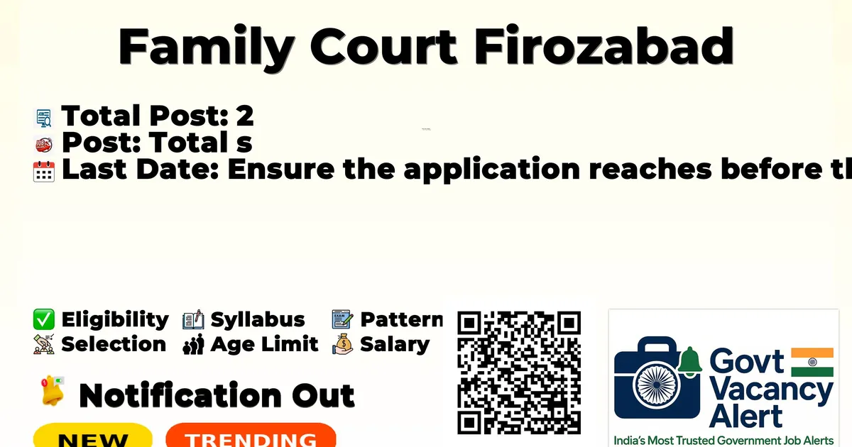 Family Court Firozabad Counselor Notification 2026 has been released on 28 February 2026 on the official website of Family Court Firozabad. A total of 2 vacancy has been announced through the Family Court Firozabad Counselor Recruitment 2026. FreeJobAlert - Your Personal Govt Job Finder 10M+Users 100+Jobs/day FreeAlways ⚡ Get Custom Govt Job Alerts - Alerts by Qualification, State and Interest. Set Free Alerts ● Free · No spam · Unsubscribe anytime · freejobalert.com Candidates aged 35 to 65 years who have a Bachelor’s degree in Sociology or Psychology with social service experience (preference for Master’s in Social Work with 2 years of family counseling experience) are eligible to apply for these Counselor vacancies. The application process for Family Court Firozabad Counselor Recruitment 2026 has started and will remain open until 31 March 2026. Advertisement Company Name Family Court Firozabad Post Name Counselor No of Posts 2 Qualification B.A, BSW, M.A, MSW Age Limit Min: 35 years, Max: 65 years Last Date 31-03-2026 Apply Mode Offline Job Type Contract Candidates who are interested in applying for the Family Court Firozabad Recruitment 2026 should first download and carefully read the official notification PDF. The notification contains complete details about vacancy distribution, eligibility criteria, age limit, stipend/salary, selection process, important dates, and application instructions. Reading the official document is important to ensure that you meet all requirements before submitting the application form. Download Family Court Firozabad Counselor Job 2026 Notification PDF Post Name Total Posts Counselor 2 Total 2 Counselor: Bachelor's degree in Sociology or Psychology with experience in social service. Preference: Master's degree in Social Work with 2 years experience in family counseling. Category Fee General/OBC Nil Minimum Age: 35 years Maximum Age: 65 years Event Date Last Date for Application Submission 31 March 2026 Submission of applications Scrutiny by State Government Preparation of shortlist of 5 candidates per post Review and recommendation by High Court expert Final notification by State Government Candidates who wish to apply for Family Court Firozabad Counselor Recruitment 2026 through offline mode should follow the steps below. Read the official notification carefully before applying. Download the application form from the official website: . Fill the application form carefully with correct information. Attach self-attested copies of required documents such as photograph, signature, ID proof, and certificates. Check all details carefully before submission. Send the completed application form to the address mentioned in the notification through Speed Post / Registered Post or as instructed. Ensure the application reaches before the last date: 31-03-2026. Keep a photocopy of the submitted application form for future reference. Link Description Link Official Notification PDF Click here Official Website Click here FreeJobAlert - Your Personal Govt Job Finder 10M+Users 100+Jobs/day FreeAlways ⚡ Get Custom Govt Job Alerts - Alerts by Qualification, State and Interest. Set Free Alerts ● Free · No spam · Unsubscribe anytime · freejobalert.com