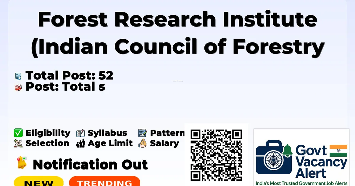 Company Name Forest Research Institute (Indian Council of Forestry Research & Education) Post Name JRF, Field Assistant and More No of Posts 52 Advt No 5-1/RCS/2026 (Advert.) Salary Rs. 42,000 (SPA), Rs. 24,000 (JPF), Rs. 37,000 (JRF), Rs. 22,000 (PA), Rs. 20,000 (FA) per month Qualification M.Sc. in Forestry/Botany/Biotechnology/Environmental Science/Agroforestry (with NET for JRF), B.Sc. in relevant subjects, or Intermediate qualification Age Limit 28-40 years depending on post, relaxable by 5 years for SC/ST/Women/OBC/PwD Notification Date 01-02-2026 Walk-in Date 19-02-2026, 20-02-2026, 23-02-2026, 24-02-2026 Apply Mode Walk-in Job Type Project-based