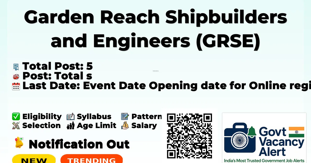 Company Name Garden Reach Shipbuilders and Engineers (GRSE) Post Name Executive Director, Senior Manager and More No of Posts 5 Salary Rs. 70,000/- Rs. 3,00,000/- Per Month Qualification B.E./B.Tech in Engineering, MBA/PG Degree/PG Diploma, Graduate. Age Limit 45- 56 Years Last Date 29 March 2026 Apply Mode Online Job Type Full Time