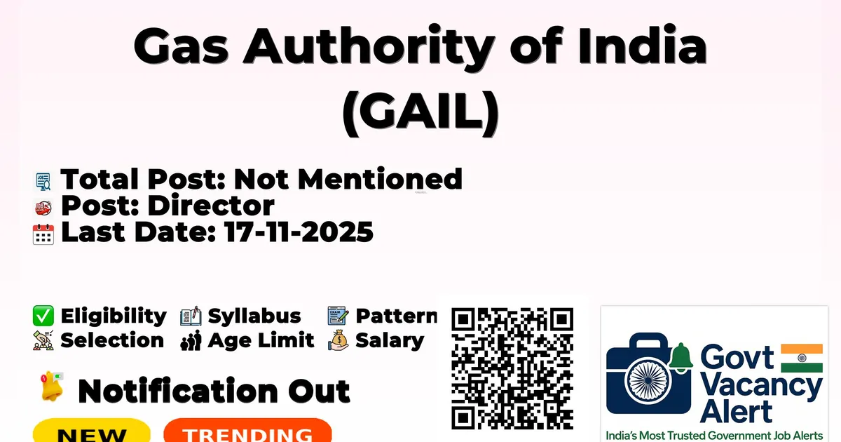 Gas Authority of India (GAIL) has released an official notification for the recruitment of Director Posts. Interested and eligible candidates can apply Online through the official GAIL website. The last date to submit the application form is 17-11-2025. In this article, you’ll find the GAIL Director Posts recruitment details, including eligibility criteria, age limit, salary structure, selection process, application steps, and direct links to the official notification and Online application form.