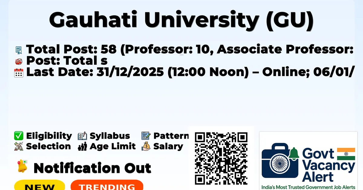 Gauhati University has released an official notification for the recruitment of 58 Teaching positions Posts. Interested and eligible candidates can apply Online through the official Gauhati University website. The last date to submit the application form is 31-12-2025. In this article, you’ll find the Gauhati University Teaching positions Posts recruitment details, including eligibility criteria, age limit, salary structure, selection process, application steps, and direct links to the official notification and Online application form.