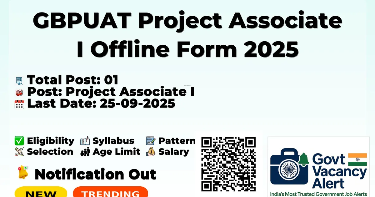 The Govind Ballabh Pant University of Agriculture and Technology (GBPUAT) Recruitment 2025 for 01 posts of Project Associate I. Candidates with M.Sc, MFSc Can Apply Offline. The Offline application opens on 10-09-2025, and closes on 25-09-2025. The candidate shall apply Offline through GBPUAT website, gbpuat.ac.in. The GBPUAT Project Associate I Recruitment 2025 Notification PDF has been released on 13-09-2025 at gbpuat.ac.in. Check the complete job details, vacancy, age limit, application fee, selection process and how to apply from the article. You can Check all Latest Sarkari Result Updates of All Central Government Jobs and State Government Jobs. GBPUAT Project Associate I Recruitment 2025 Notification PDF