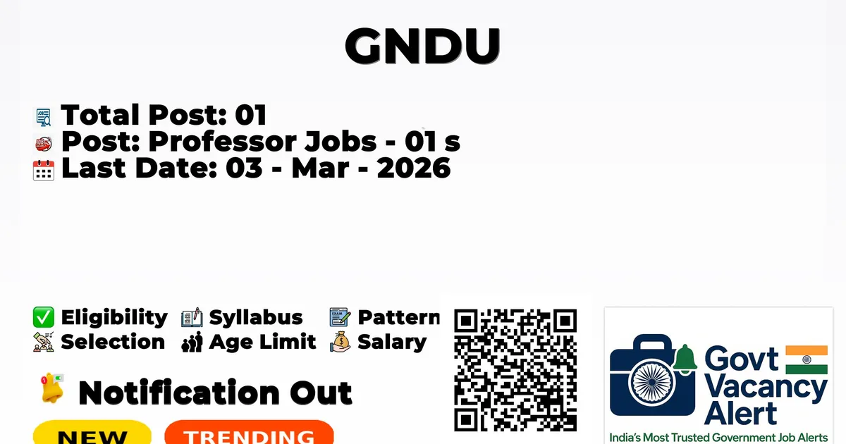 Guru Nanak Dev University (GNU) has announced the official notification for 2026. To fill up the various vacancies for Professor Jobs. Those candidates who have qualified in the Post Graduation, Ph.D can use this chance and apply for the GNDU Notification 2026. Here, we included the age limit, selection process, salary structure, education details, application fee, and how to apply for these posts.