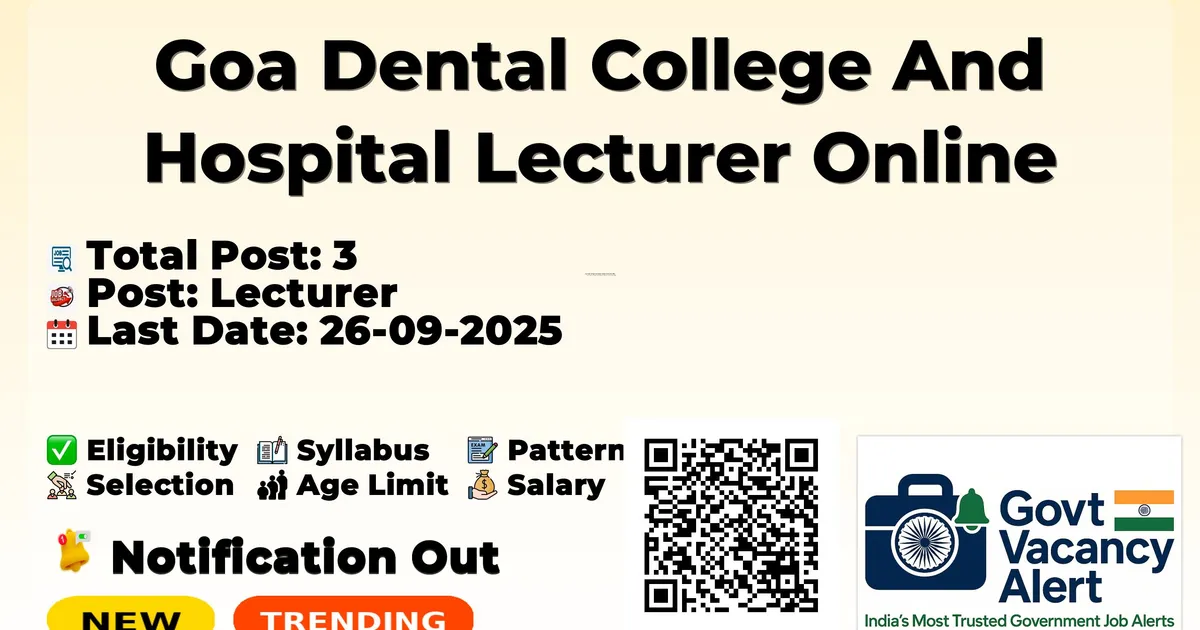 The Goa Dental College And Hospital Recruitment 2025 for 3 posts of Lecturer. Candidates with Master of Dental Surgery Can Apply Online. The online application opens on 12-09-2025, and closes on 26-09-2025. The candidate shall apply online through Goa Dental College And Hospital website, cbes.goa.gov.in.