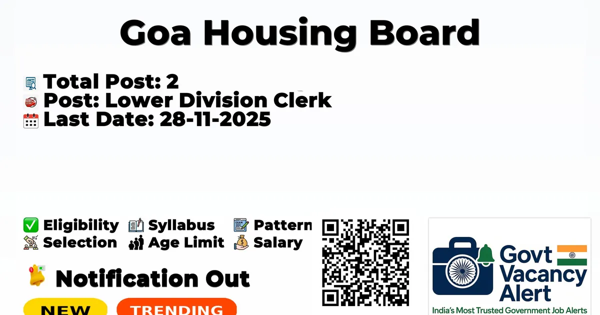 Company Name Goa Housing Board Post Name Lower Division Clerk No of Posts 2 Qualification Diploma Age Limit 45 years Start Date for Apply 07-11-2025 Last Date for Apply 28-11-2025 Official Website goa.gov.in