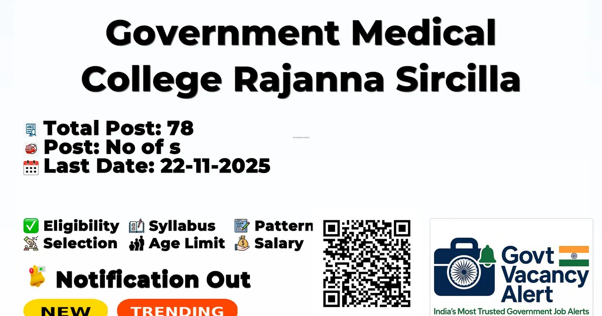 Government Medical College Rajanna Sircilla (GMC Rajanna Sircilla) has released an official notification for the recruitment of 78 Professor, Senior Residents and More Posts. Interested and eligible candidates can apply Offline through the official GMC Rajanna Sircilla website. The last date to submit the application form is 22-11-2025. In this article, you’ll find the GMC Rajanna Sircilla Professor, Senior Residents and More Posts recruitment details, including eligibility criteria, age limit, salary structure, selection process, application steps, and direct links to the official notification and Offline application form.