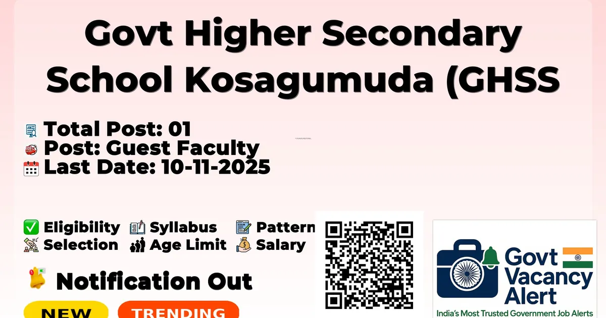 Govt Higher Secondary School Kosagumuda (GHSS Kosagumuda) has released an official notification for the recruitment of 01 Guest Faculty Posts. Interested and eligible candidates can apply Offline through the official GHSS Kosagumuda website. The last date to submit the application form is 10-11-2025. In this article, you’ll find the GHSS Kosagumuda Guest Faculty Posts recruitment details, including eligibility criteria, age limit, salary structure, selection process, application steps, and direct links to the official notification and Offline application form.