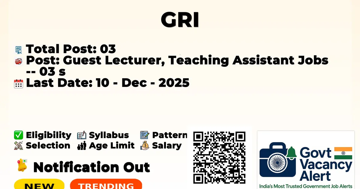 The Gandhigram Rural Institute (GRI Dindigul) has officially released the notification to fill the vacancies of 03 Guest Lecturer, Teaching Assistant Jobs. Interested and eligibile candidates can use this opportunity to apply for these posts before the last date of application. Candidates who have completed their B.E./B. Tech, M.E./M. Tech in Electrical, Mechanical Engineering, M.Sc., and Ph.D. can apply for the GRI Dindigul Jobs 2025. The interested applicants can attend the walk-in interview. Here we have mentioned the education details, age limit, selection process, application fee, salary, and how to apply for these posts before the deadline. The application dates have already begun.