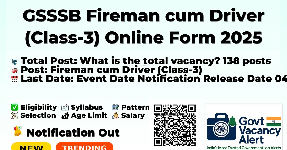 Details Information Organization Name Gujarat Gaun Seva Pasandgi Mandal (Gujarat Subordinate Service Selection Board) (GSSSB) Post Name Fireman cum Driver (Class-3) Total Vacancies 138 Posts Salary/Pay Scale Rs. 26,000/- fixed for first 3 years; After 5 years Rs. 19,900/- to Rs. 63,200/- (Level-2) Educational Qualification HSC or equivalent; 6-month Fireman course; Heavy Motor Vehicle License Age Limit 18 to 33 years Application Start Date 09/12/2025 Application End Date 23/12/2025 Application Mode Online Official Website gsssb.gujarat.gov.in