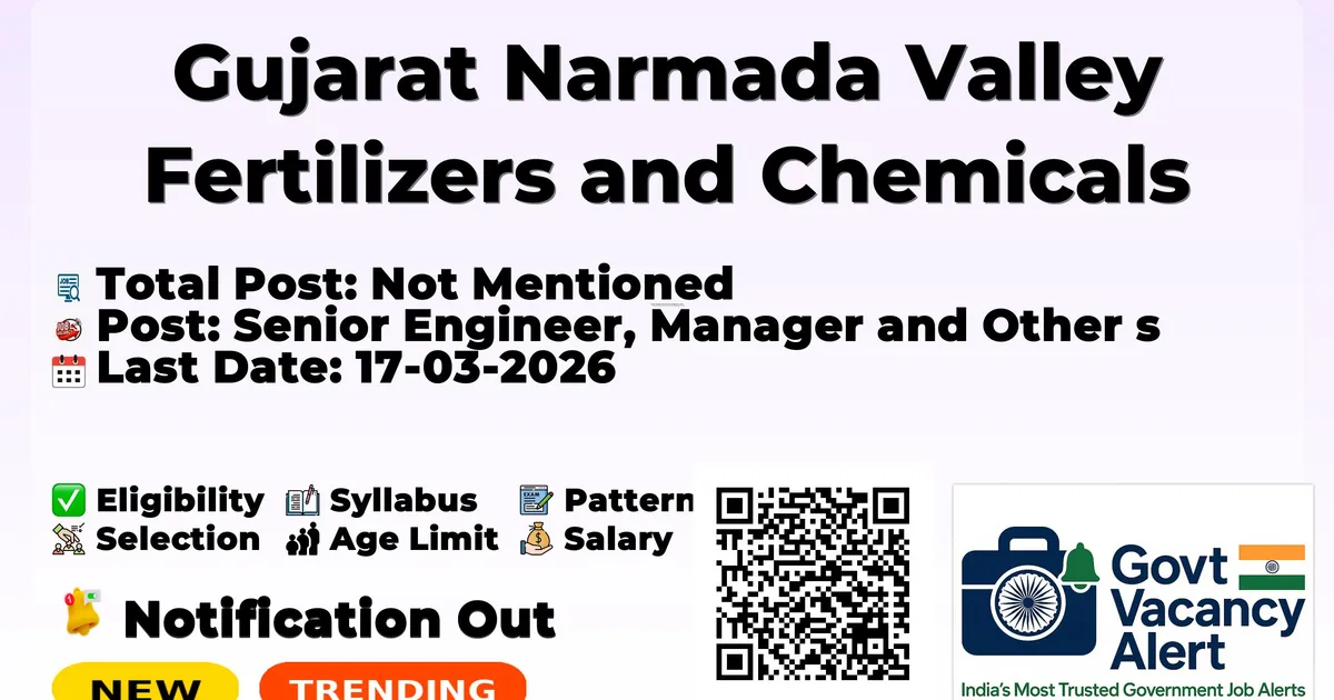 Gujarat Narmada Valley Fertilizers and Chemicals (GNFC) has released an official notification for the recruitment of Not Mentioned Senior Engineer, Manager and Other Posts. Interested and eligible candidates can apply Online through the official GNFC website. The last date to submit the application form is 17-03-2026. In this article, you’ll find the GNFC Senior Engineer, Manager and Other Posts recruitment details, including eligibility criteria, age limit, salary structure, selection process, application steps, and direct links to the official notification and Online application form.