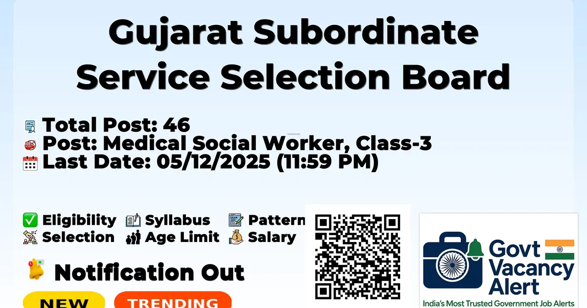 Gujarat Subordinate Service Selection Board (GSSSB) has released an official notification for the recruitment of 46 Medical Social Worker Posts. Interested and eligible candidates can apply Online through the official GSSSB website. The last date to submit the application form is 05-12-2025. In this article, you’ll find the GSSSB Medical Social Worker Posts recruitment details, including eligibility criteria, age limit, salary structure, selection process, application steps, and direct links to the official notification and Online application form.