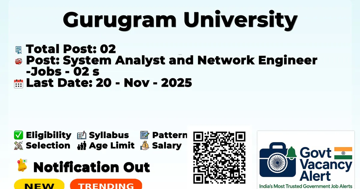 Gurugram University has announced the official notification for 2025. To fill up the vacancies for 02 System Analyst and Network Engineer Jobs. Those candidates who have qualified in the Diploma, B.E/ B.Tech, and M.Sc can grab this chance and apply for the Gurugram University Recruitment 2025. Here, we include the age limit, selection process, salary structure, education details, application fee, and how to apply for these posts.