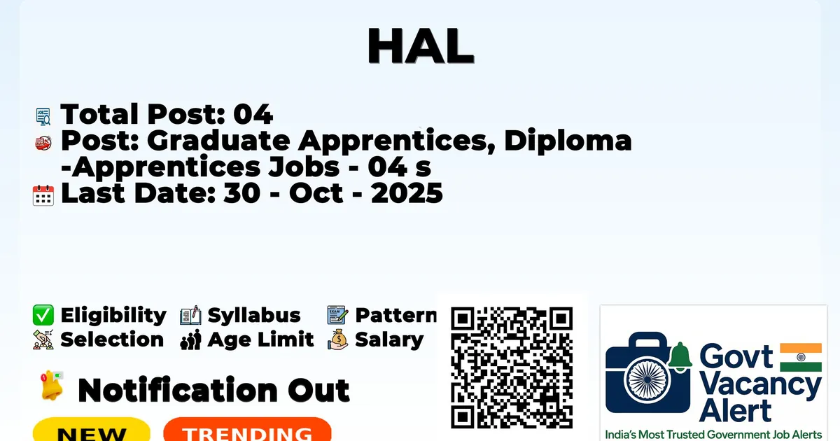 The Hindustan Aeronautics Limited (HAL Limited) has officially released the notification to fill the vacancies of 04 Graduate Apprentices and Diploma Apprentices. Interested and eligibile candidates can use this opportunity to apply for these posts before the last date of application. Candidates who have completed their Any Degree, B.E./B. Tech, Diploma in Civil, Electrical, Electronics, and Mechanical Engineering, can apply for the HAL India Notification 2025. The interested applicants can apply in online mode. Here we have mentioned the education details, age limit, selection process, application fee, salary, and how to apply for these posts before the deadline. The application dates have already begun.