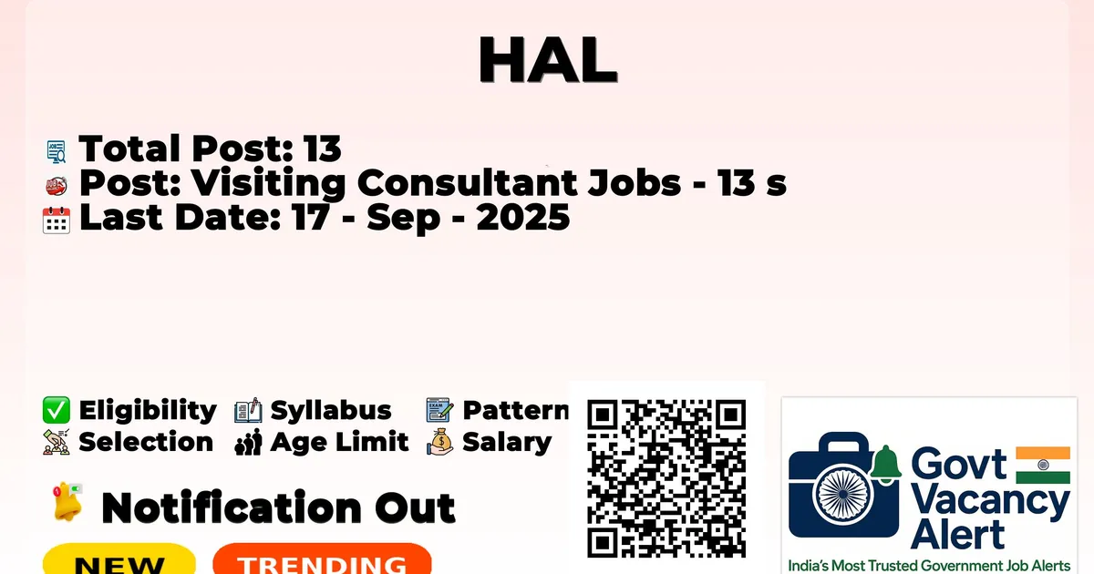 The Hindustan Aeronautics Limited (HAL), Karnataka, has officially released the notification for 2025. To fill up the vacancies for 13 Visiting Consultant Jobs. Those candidates who have qualified in the MBBS, MS/ MS, MDS, and BHMS can grab this chance and apply for these posts. Here, we include the age limit, selection process, salary structure, education details, application fee, and how to apply for the HAL Recruitment 2025. Interested and eligible aspirants can fill out the application form before the deadline. For more details, visit the official website.
