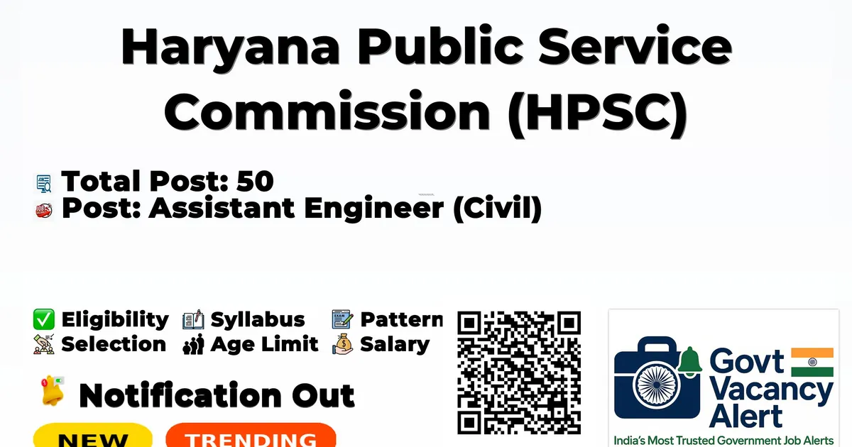 Company Name Haryana Public Service Commission (HPSC) Post Name Assistant Engineer (Civil) No of Posts 50 Salary Rs. 53100-167800 Qualification Degree in Civil Engineering from any University recognized by UGC and approved by AICTE; Hindi / Sanskrit upto Matric or Higher Standard Age Limit 18 to 42 years Start Date 13/01/2026 Last Date 12/02/2026 Official Website https://hpsc.gov.in