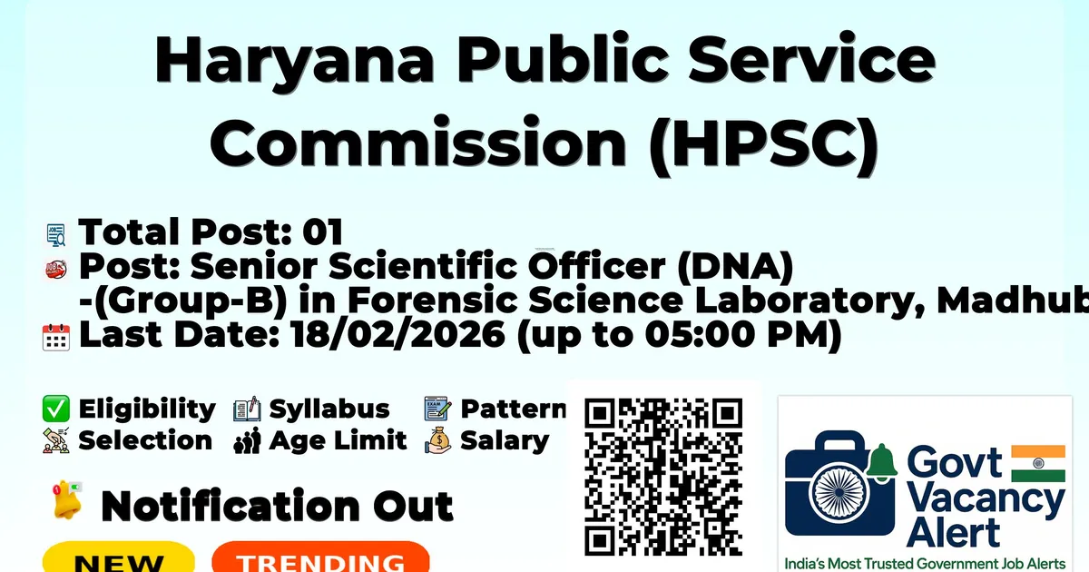 Haryana Public Service Commission (HPSC) has released an official notification for the recruitment of 01 Senior Scientific Officer Posts. Interested and eligible candidates can apply Online through the official HPSC website. The last date to submit the application form is 18-02-2026. In this article, you’ll find the HPSC Senior Scientific Officer Posts recruitment details, including eligibility criteria, age limit, salary structure, selection process, application steps, and direct links to the official notification and Online application form.
