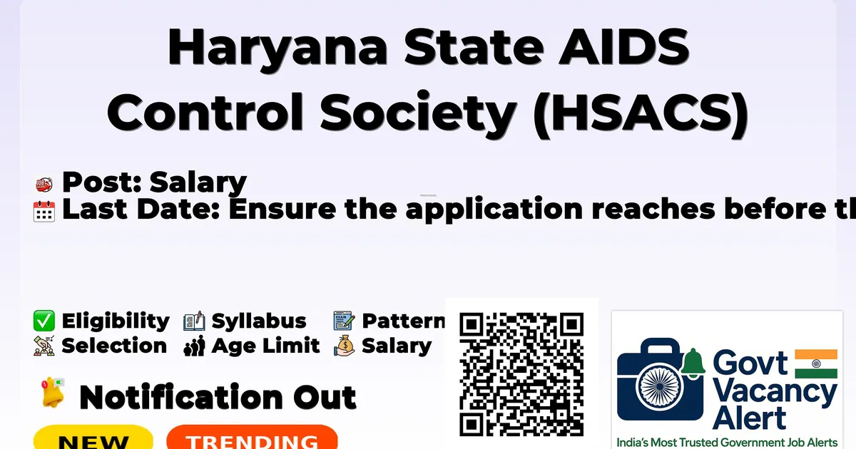Haryana state AIDS Control Society (HSACS) has released an official notification for the recruitment of 04 Cluster Prevention Officer, Clinical Service Officers and More Posts. Interested and eligible candidates can apply Offline through the official HSACS website. The last date to submit the application form is 25-02-2026. In this article, you’ll find the HSACS Cluster Prevention Officer, Clinical Service Officers and More Posts recruitment details, including eligibility criteria, age limit, salary structure, selection process, application steps, and direct links to the official notification and Offline application form.