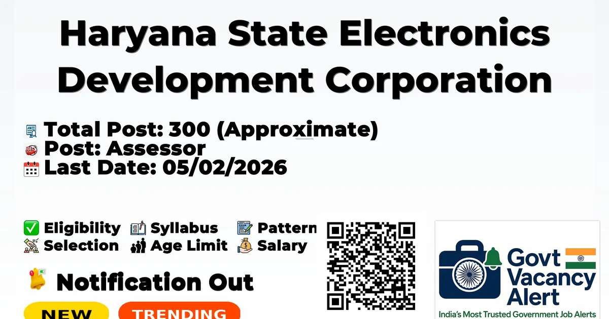 Haryana State Electronics Development Corporation (HARTRON) has released an official notification for the recruitment of 300 Assessors Posts. Interested and eligible candidates can apply Online through the official HARTRON website. The last date to submit the application form is 05-02-2026. In this article, you’ll find the HARTRON Assessors Posts recruitment details, including eligibility criteria, age limit, salary structure, selection process, application steps, and direct links to the official notification and Online application form. Trending Govt Jobs Bank of Maharashtra 600 Apprentice Online form 2026 RBI 572 Office Attendant Online Form 2026 IOCL Western Region 405 Apprentice Online Form 2026 RRB 22000 Group D Online form 2026 Indian Navy 260 SSC Officer Online Form 2026 Advertisement Company Name Haryana State Electronics Development Corporation Limited (HARTRON) Post Name Assessor No of Posts 300 (Approximate) Salary Rs. 1200-2000 Per day Qualification B.E. / B.Tech (IT/Computer Science) OR MCA OR M.Sc. (IT / Computer Science); Minimum 2 years experience in the field of IT/CS Start Date for Apply 15/01/2026 Last Date for Apply 05/02/2026 Official Website www.hartron.org.in Free Online Mock Tests View all Railway NTPC Mock Test Attempt Now IBPS Clerk Mock Test Attempt Now SSC CHSL Mock Test Attempt Now View All Mock Tests District Name Approx. no. of required Assessors Ambala 8 Bhiwani 18 Charkhi Dadri 12 Faridabad 6 Fatehabad 18 Gurugram 6 Hisar 34 Jind 16 Jhajjar 4 Kaithal 24 Karnal 14 Kurukshetra 18 Mahendragarh 12 Nuh 8 Palwal 8 Panipat 16 Rewari 10 Rohtak 18 Sirsa 14 Sonipat 18 Yamuna Nagar 18 Panchkula 0 Total 300 Qualifications: B.E. / B.Tech (IT/Computer Science) OR MCA OR M.Sc. (IT / Computer Science) Essential qualifications: Minimum 2 years experience in the field of IT/CS. Desirable: Preference to candidates having teaching / training experience. Experience: Minimum 2 years experience in the field of IT/CS. Consolidated Remuneration of ₹1200/- per day per batch inclusive of TA/DA (in case of one batch) and ₹2000/- per day (upto two batches) inclusive of TA/DA. Maximum 2 batches per day at any HSC and HASC within same district. If need be, the assessors of adjoining Districts may also be deployed during examination. Application fee of Rs.590/- (including GST) will be payable by the candidate online while submitting Application Form. Event Date (dd/mm/yyyy) Start Date for Online Application 15/01/2026 (from 09:00 AM) Last Date for Online Application 05/02/2026 (up to 11:59 PM) Publication of Advertisement Inviting On-line Application through HARTRON Web Portal i.e. www.hartron.org.in Verification of details as uploaded by candidate through Portal Conduct Computer based online examination to check IT skills of applied candidate at our HMSDC Gurugram & IDDC Ambala Exam Centers. Biometric verification and Scrutiny of documents before online exam. (Candidates must to bring original documents with self-attested copies of requisite documents: 10th DMC, 12th DMC, Degree - B.Tech. / B.E. / MCA with Marksheet of all Semesters, Identity Proof - Aadhaar Card, Experience Letter, Self Declaration regarding non-Linkage with any HSCs / HASCs) Interview of online exam qualified candidates only. Empanelment of Assessors initially for a period of one year and extended on year to year basis after reviewing their performance. The Candidate must be a citizen of India. All qualifications and experiences will be considered up to the cutoff date. The candidates are advised to satisfy themselves about their eligibility before applying. The empanelment of Assessor can be cancelled any time, without assigning any reason. Candidate needs to bring original eligibility documents alongwith one set of self attested photocopy at the time of Interview. District-wise details of Assessors required are enclosed. Candidate can be deployed in adjoining district also on his/her consent. No TA/DA shall be paid to the candidates for attending the online-test / interview/ any other assessment test. The prescribed essential qualifications and experience are minimum and mere possession of the same does not entitle a candidate to be called for interview. HARTRON reserves its right to place reasonable limits on the total number of candidates to be called for an interview. The number of such candidates will be decided by the Committee constituted for the purpose. No enquiry in this regard will be entertained. In case of any dispute, any suit or legal proceedings against HARTRON, the territorial jurisdiction shall be restricted to the District Court Panchkula, Haryana and Punjab & Haryana High Court, Chandigarh. Hartron reserves the rights not to empanel any assessor(s). In case of any inadvertent mistake in the process of selection, if detected at any stage even after the issue of empanelment order. HARTRON reserves the right to modify/ withdraw/ cancel any communication sent to the candidate(s). The initial period of empanelment will be for one year and can be extended further on the basis of performance and as per HARTRON norms. The Interview will be held at Panchkula /Ambala/Gurugram. No communication will be sent to individuals separately. No offline applications will be accepted. No separate communication will be sent to individual applicants. Candidates are advised to visit Hartron Portal on regular basis for updates issued by Hartron related to empanelment of Assessors. No other / individual communication will be sent. MD, HARTRON reserves the right to cancel or modify the empanelment process at any stage without assigning any reason. For further queries (if any) please contact @ 0172-2564486, 0171-2610418. HARTRON invites online applications for empanelment of technically qualified Computer Professionals to work as Assessors on Part-time Basis at District-level in all Districts of Haryana, except Panchkula and Chandigarh. Inviting On-line Application through HARTRON Web Portal i.e. www.hartron.org.in Ap
