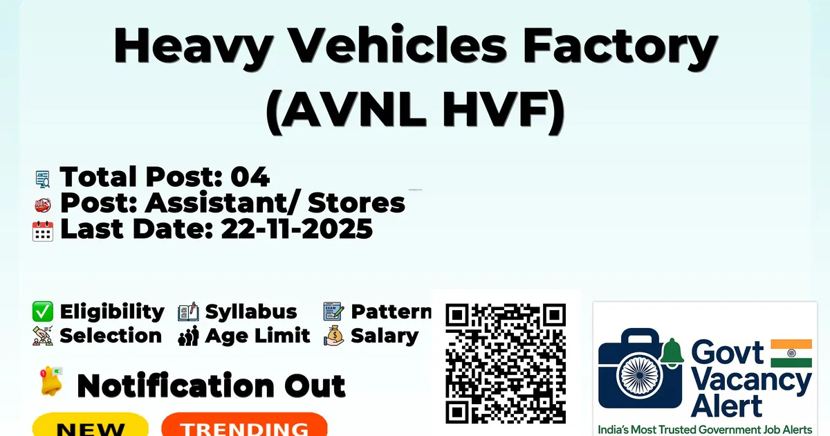 Heavy Vehicles Factory (AVNL HVF) has released an official notification for the recruitment of 04 Assistant Posts. Interested and eligible candidates can apply Offline through the official AVNL HVF website. The last date to submit the application form is 22-11-2025. In this article, you’ll find the AVNL HVF Assistant Posts recruitment details, including eligibility criteria, age limit, salary structure, selection process, application steps, and direct links to the official notification and Offline application form.