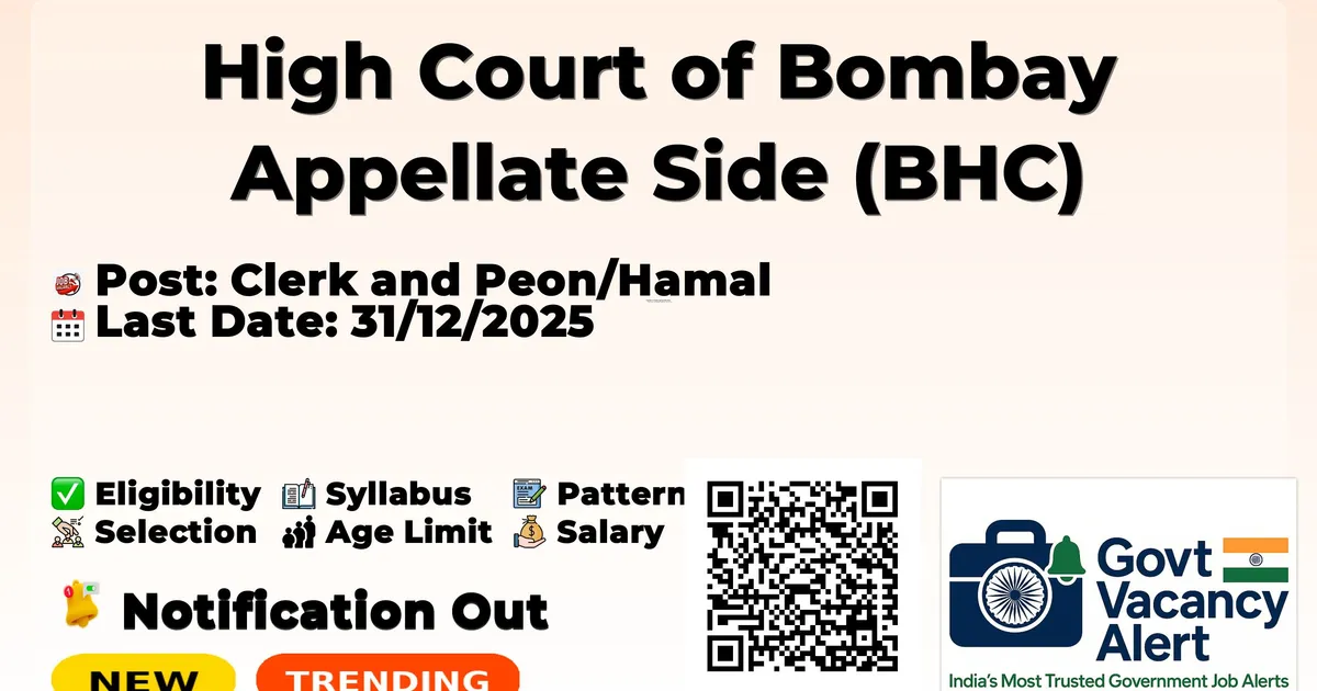 Company Name High Court of Bombay Appellate Side (BHC) Post Name Clerk and Peon/Hamal Salary S-10 : 29200-92300 for Clerk, S-3 : 16600-52400 for Peon/Hamal Start Date for Apply 08/12/2025 Last Date for Apply 31/12/2025 Official Website bombayhighcourt.nic.in
